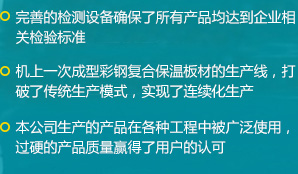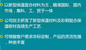 公司是一家瞄準國際、國內(nèi)市場,集科、工、貿(mào)于一體的綜合性公司,擁有各類先進的設備100余臺(套),公司自主研發(fā)了新型保溫材料及彩鋼復合保溫板材連續(xù)生產(chǎn)工藝,建成了機上一次成型彩鋼復合保溫板材的生產(chǎn)線...